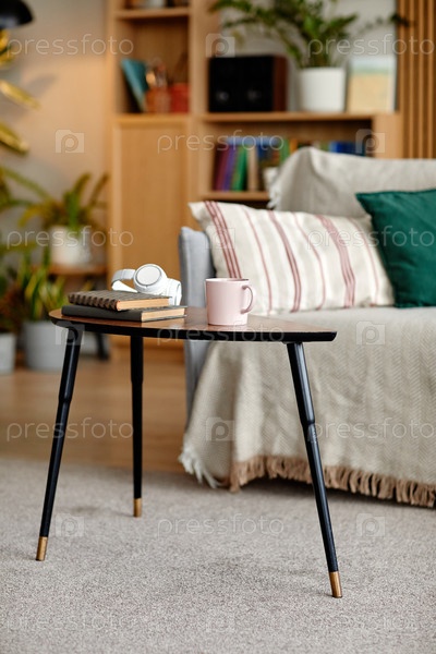 Кофейный стол с современными наушниками, книгами и кружкой в уютной гостиной