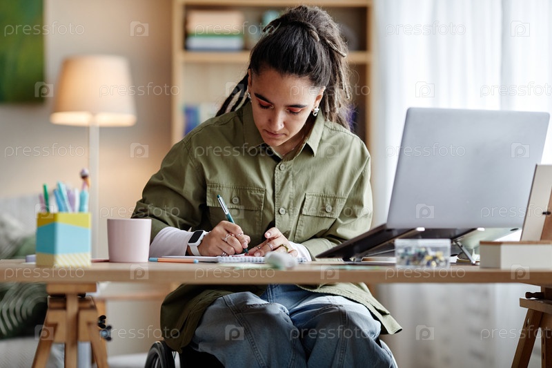 Молодая женщина-взрослый с инвалидностью учится за рабочим столом, используя ноутбук