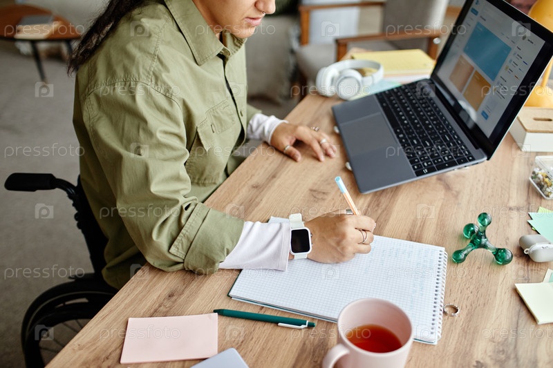 Молодая женщина-взрослый с инвалидностью пишет заметки при использовании ноутбука