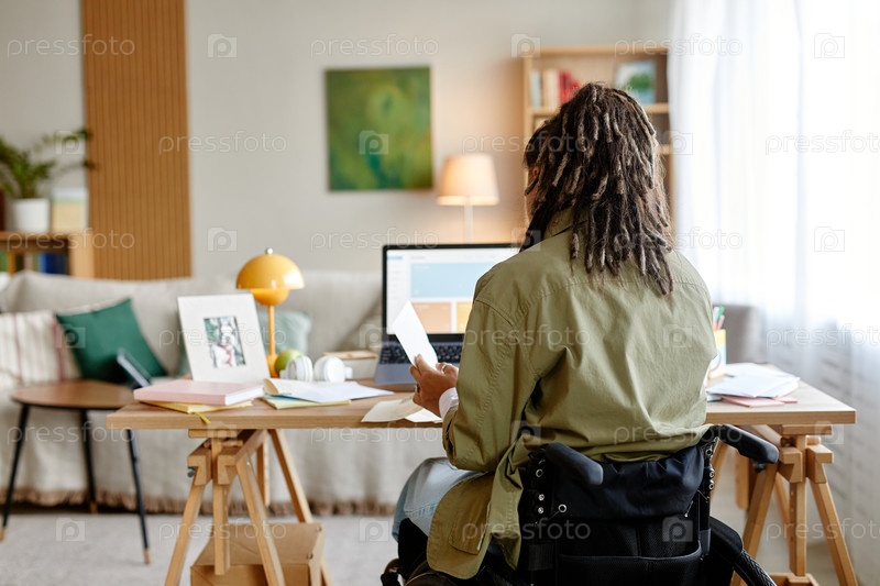 Молодая взрослая женщина с инвалидностью, работающая удаленно на рабочем столе в домашнем офисе