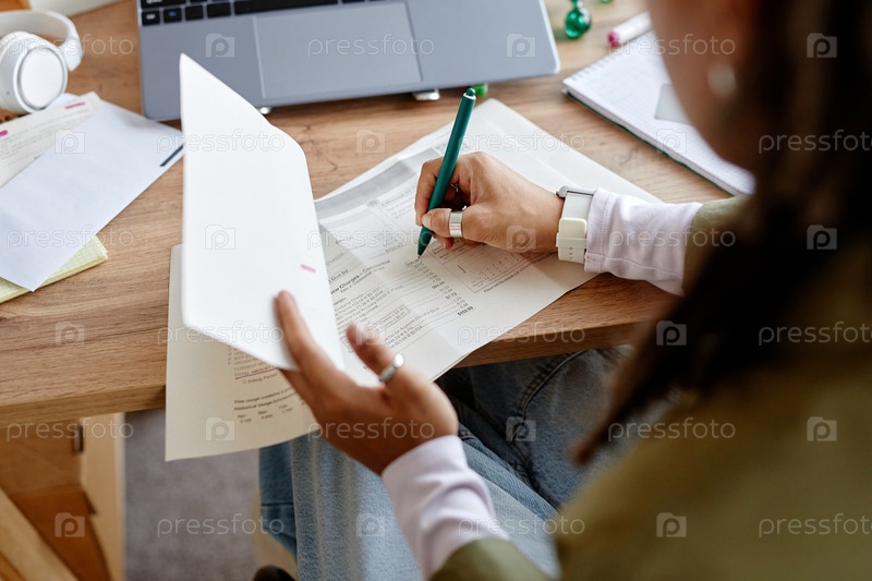 Молодая взрослая женщина просматривает финансовые документы, делая заметки