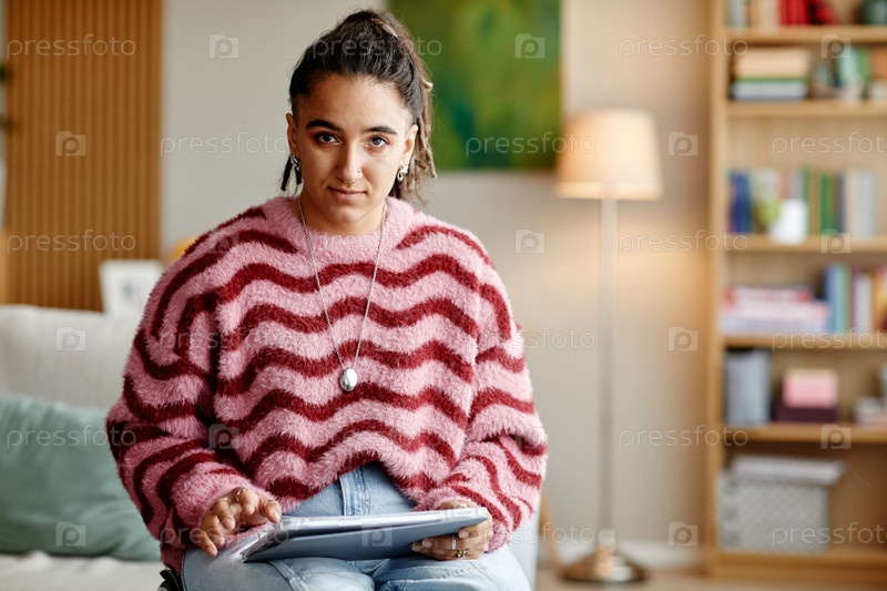 Портрет молодой взрослой женщины, использующей цифровые планшеты в помещении