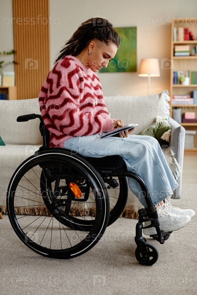 Молодая взрослая женщина с инвалидностью использует цифровые планшеты в помещении