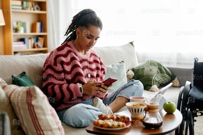 Молодая взрослая женщина сидит на диване, используя смартфон и планшет с инвалидностью