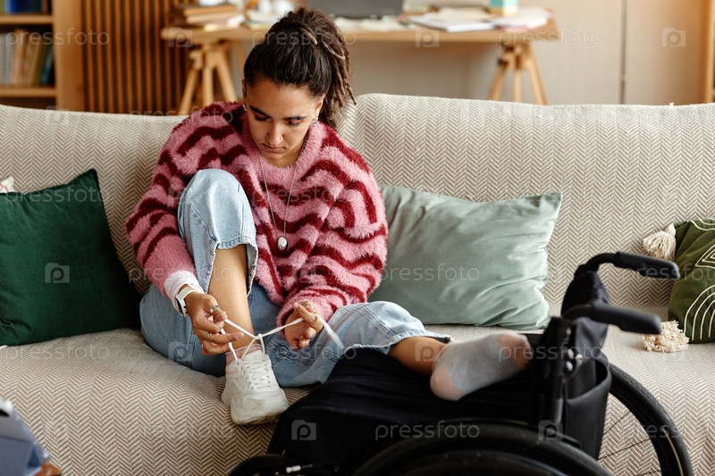 Девушка, сидящая на диване и завязывающая шнурки рядом с инвалидной коляской