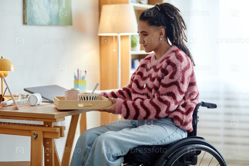 Молодая взрослая женщина с инвалидностью, использующая инвалидный кресло, работает за рабочим столом