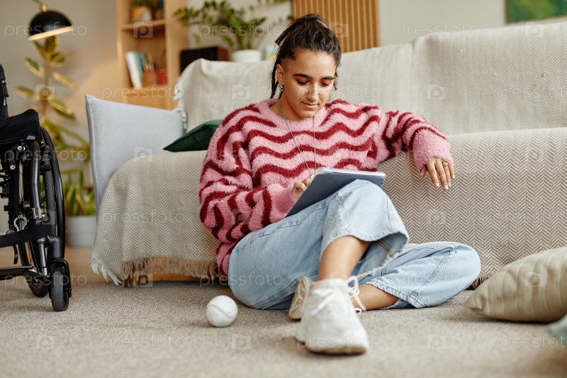 Молодая взрослая женщина, сидящая на полу с помощью цифрового планшета дома