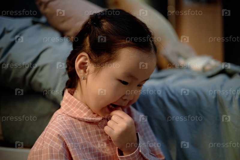 Азиатская девочка-ребенок сидит в помещении, улыбается и кусает ногти.Вечернее время