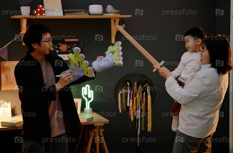 Молодые азиатские родители играют с ребенком, используя игрушечный меч и роликовые коньки дома
