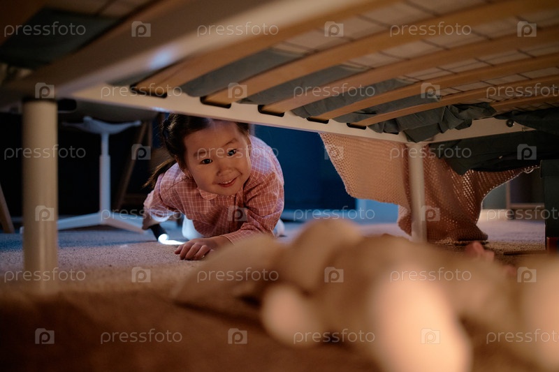 Азиатская девочка-ребенок улыбается, ползая под кроватью и добиваясь наполненной игрушки