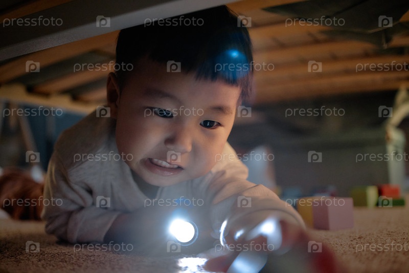 Азиатский мальчик-ребенок ползает под кроватью играя с фонариком в вечернее время