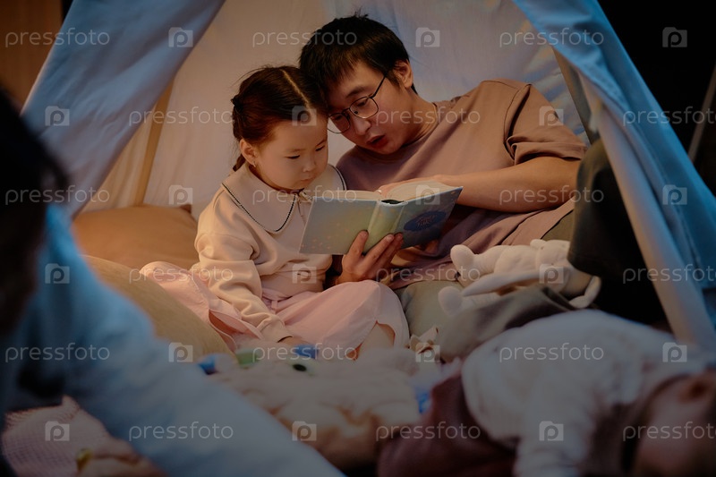 Отец читает рассказ молодой азиатской дочери во время уютного вечера в помещении