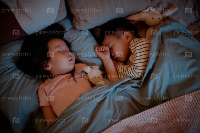 Молодые азиатские дети спят бок о бок, обнимают набитых животных ночью