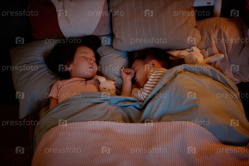 Азиатские дети спят мирно вместе в постели во время уютного вечера дома