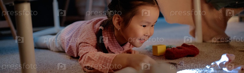 Азиатский ребенок улыбается, играя на полу во время вечера дома