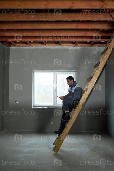 Молодой взрослый чернокожий мужчина сидит на лестнице, используя смартфон в незавершенной комнате