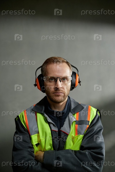 Портрет молодого взрослого мужчины, носящего защитное снаряжение и стоящего в помещении