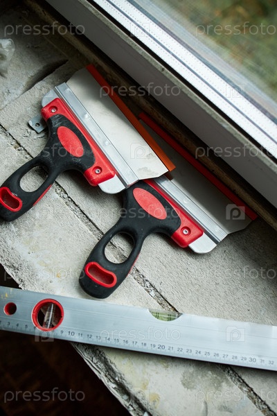 Строительные инструменты, лежащие на подоконнике во время процесса ремонта дома
