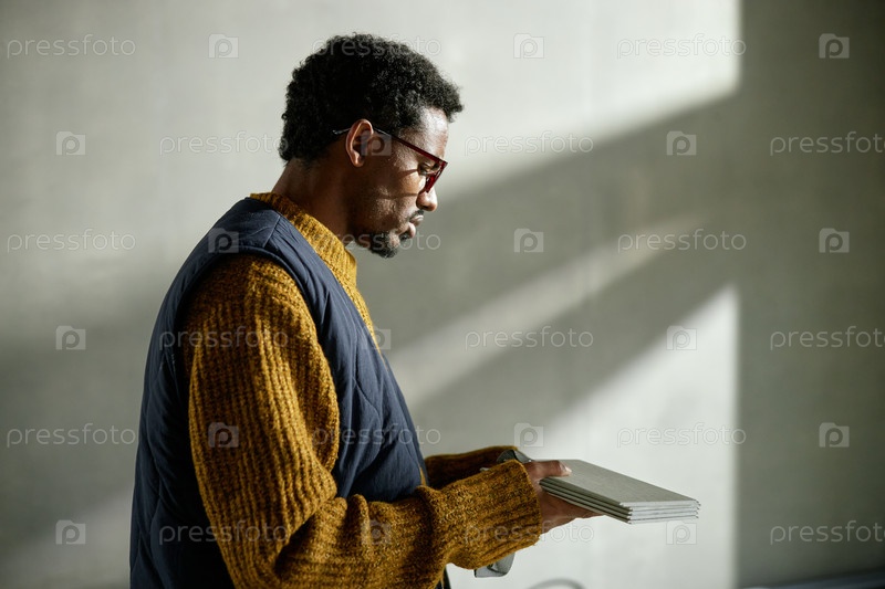 Чернокожий мужчина среднего возраста держит цветные приборы, стоя в помещении возле окна