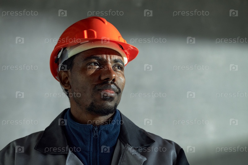 Портрет молодого взрослого чернокожего мужчины в жесткой шляпе, стоящего внутри и думающего