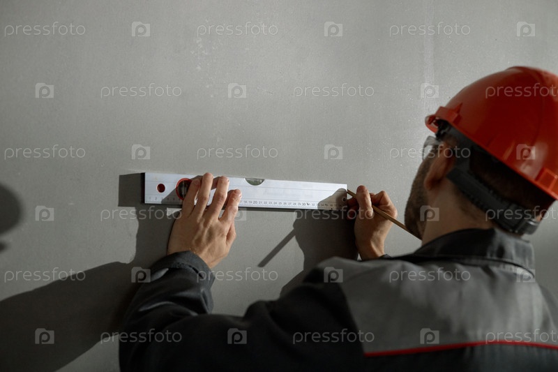 Мужчина средних лет измеряет стену с уровнем духа во время работы