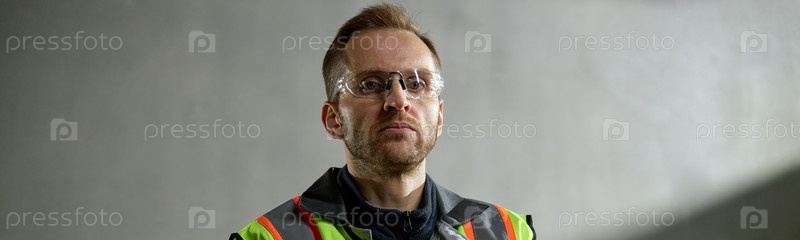 Мужчина среднего возраста, носящий защитный жилет и очки, работающий в помещении