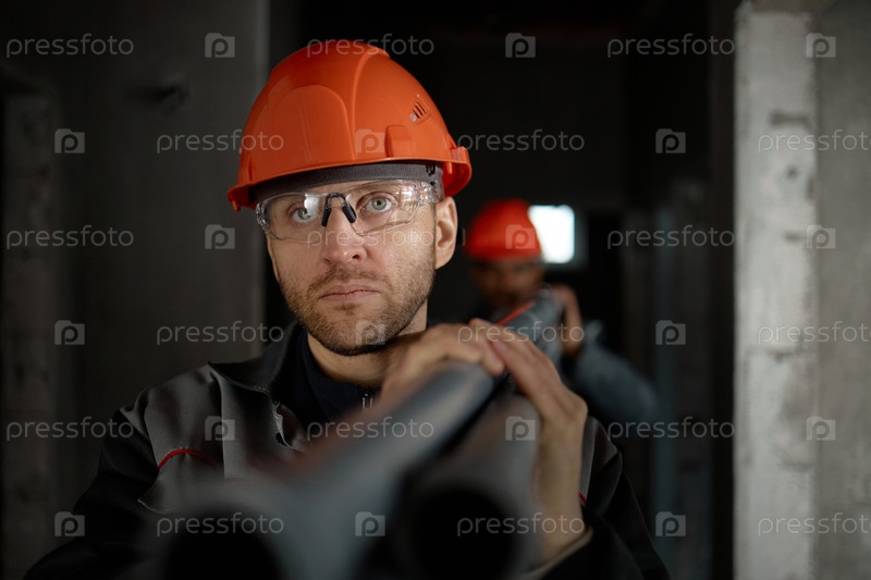 Портрет мужчины среднего возраста, одетого в жесткую шляпу и несущего металлические трубы