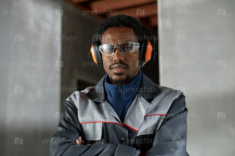 Портрет молодого взрослого чернокожего мужчины, носящего защитное снаряжение и стоящего в помещении