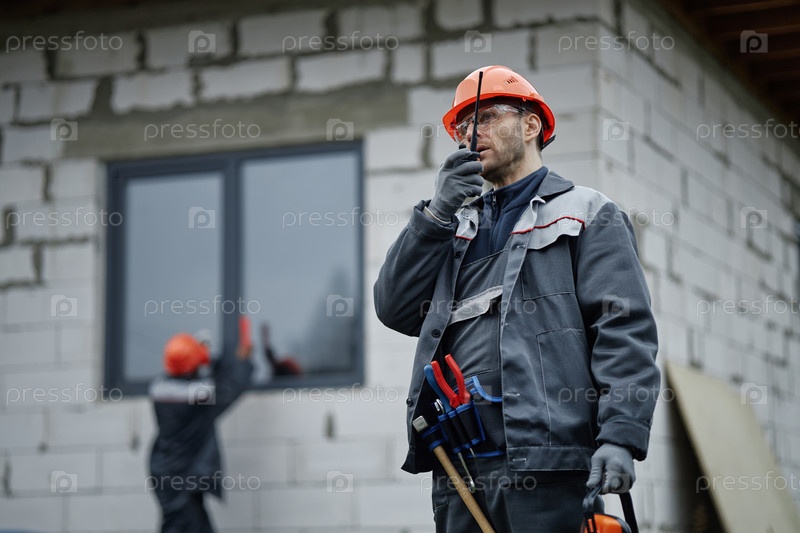Мужчина среднего возраста, использующий прослушивалку Walkie Talkie, курирует строительную площадку