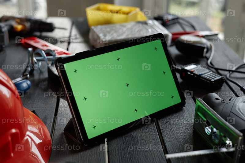 Цифровой планшет с зеленым экраном, отображаемым на строительном рабочем столе