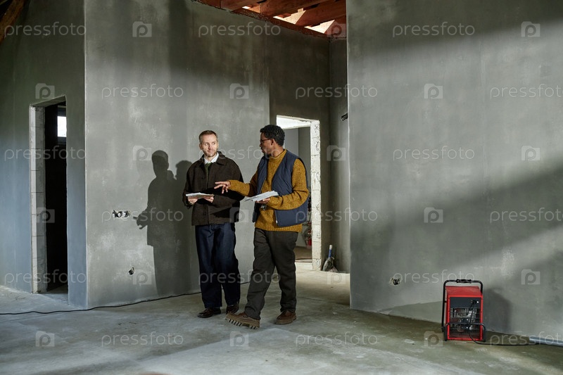 Чернокожий мужчина средних лет объясняет строительные планы коллеге в помещении