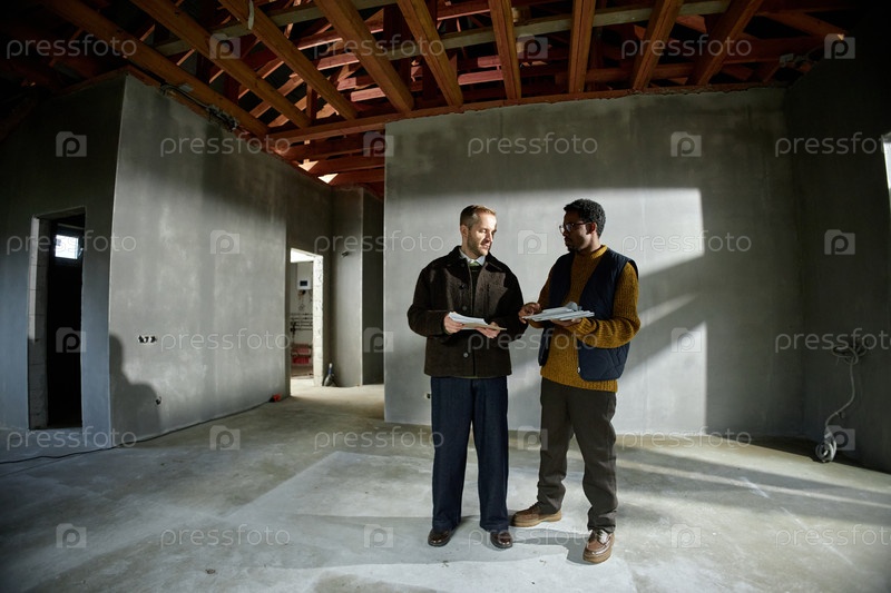 Мужчина средних лет и молодой взрослый чернокожий человек обсуждают планы строительства