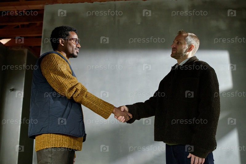 Чернокожий мужчина среднего возраста и мужчина, пожавшие друг другу руки в помещении
