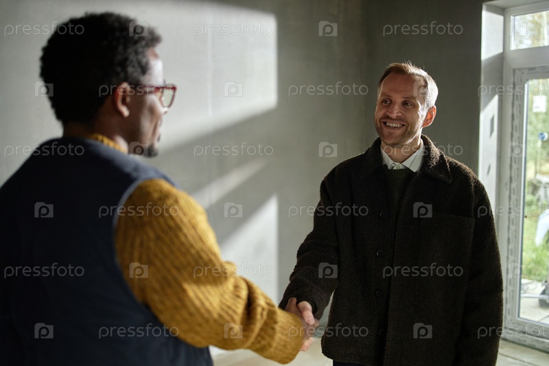 Мужчина средних лет, пожавший руку черному мужчине среднего возраста в помещении