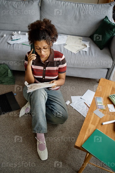 Молодая чернокожая женщина просматривает счета и фактуры, разговаривая по телефону