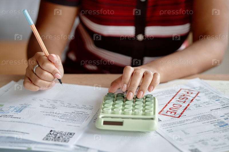 Взрослая женщина просматривает счета и рассчитывает их за столом