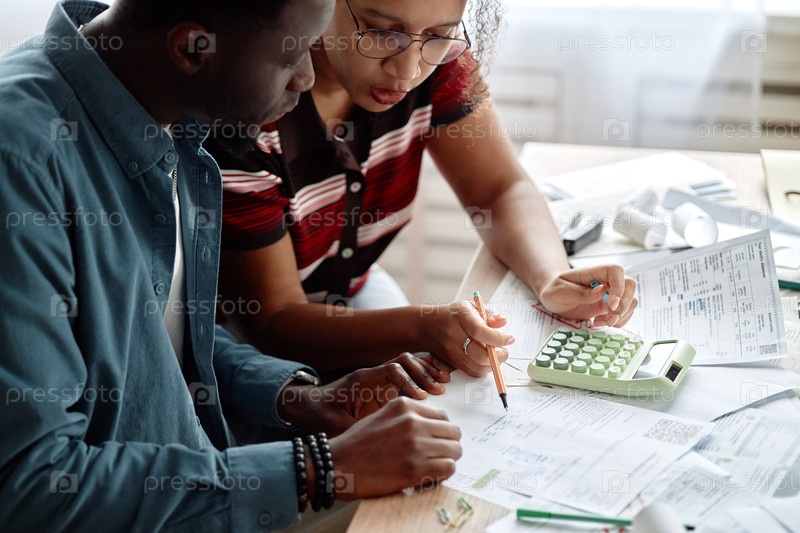 Молодой чернокожий мужчина и молодая черная женщина вместе анализируют счета