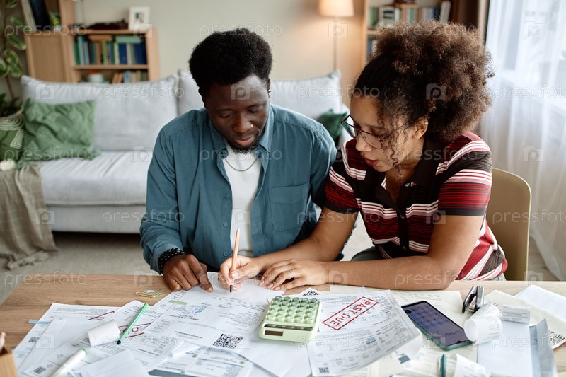 Взрослые чернокожие пары просматривают счета и фактуры вместе дома