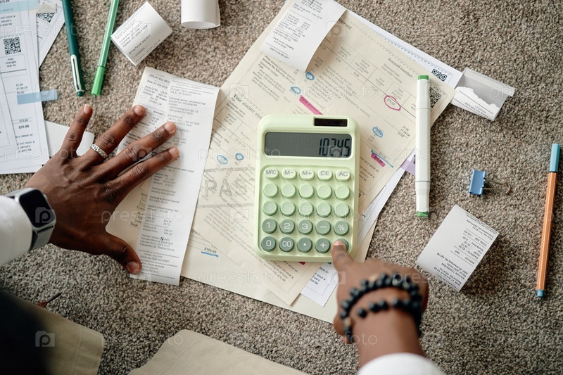 Молодой чернокожий мужчина просматривает счета и рассчитывает расходы дома