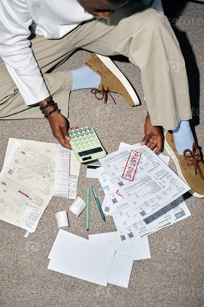Молодой чернокожий человек рассматривает просроченные счета и подсчитывает расходы