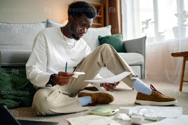 Молодой чернокожий мужчина просматривает счета и фактуры, сидя на полу