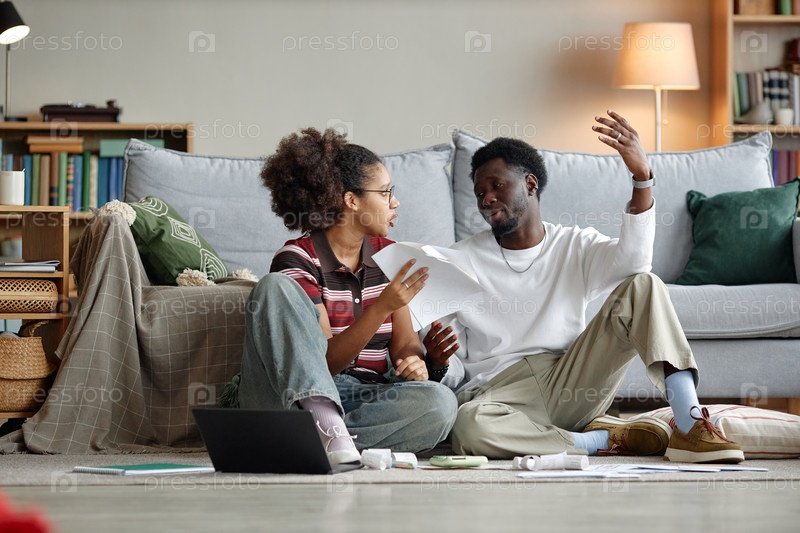Молодая мультиэтническая пара просматривает счета и обсуждает домашние счета