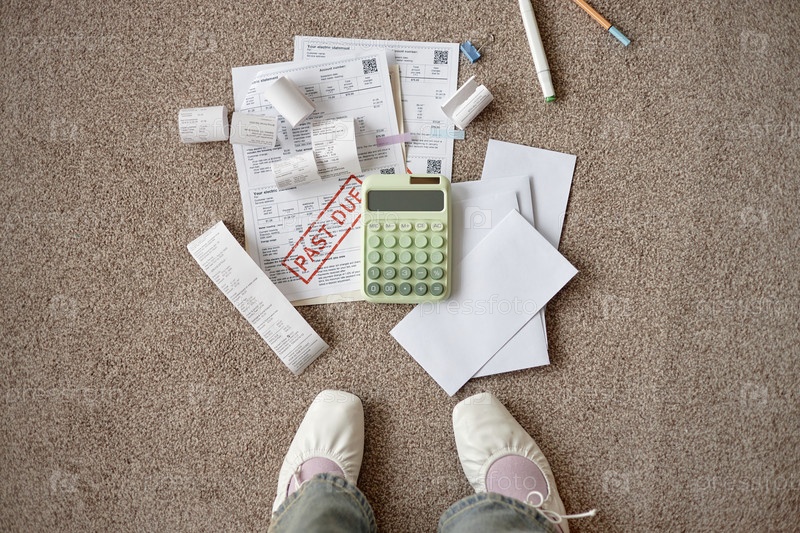 Молодая женщина пересматривает прошлые платежные счета и счета на полу