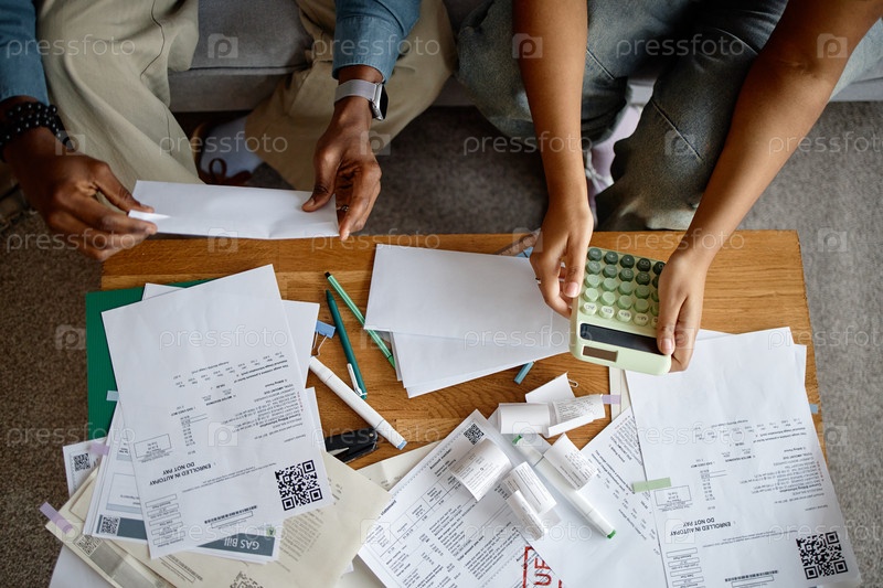Молодые мультиэтнические руки просматривают счета и рассчитывают их вместе