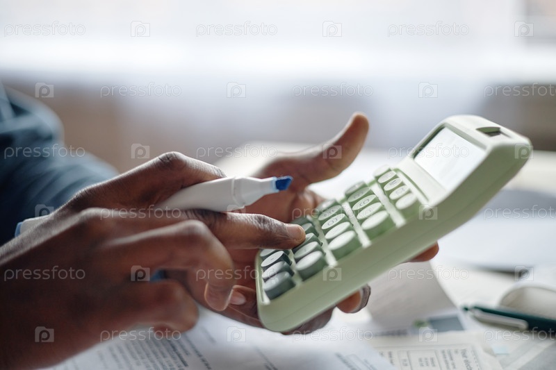 Ближайшее изображение взрослого чернокожего мужчины, рассчитывающего расходы при анализе счетов-фактур