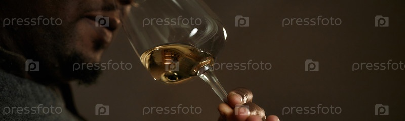Заголовок зрелого чернокожего мужчины, оценивающего аромат вина во время профессиональной дегустации