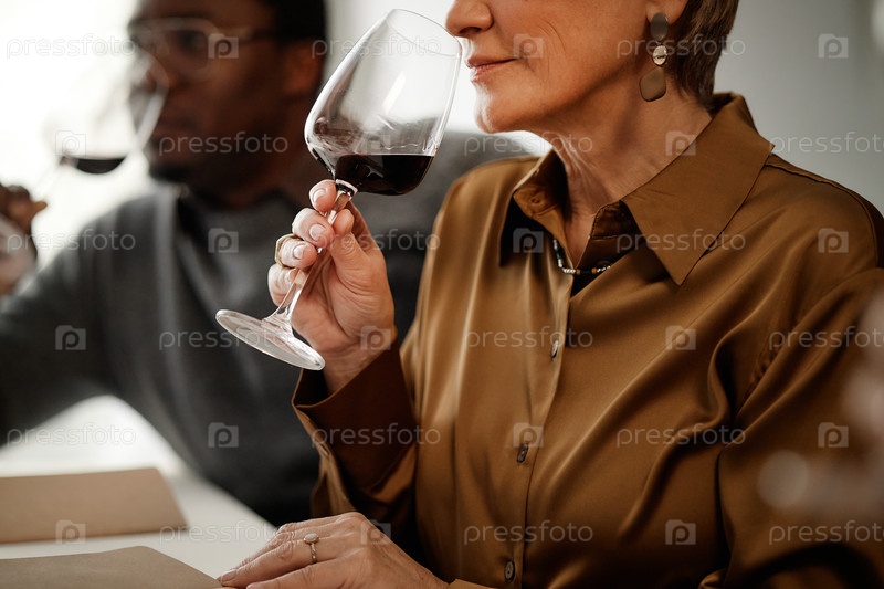 Женщина средних лет и чернокожий мужчина дегустируют красное вино вместе в помещении