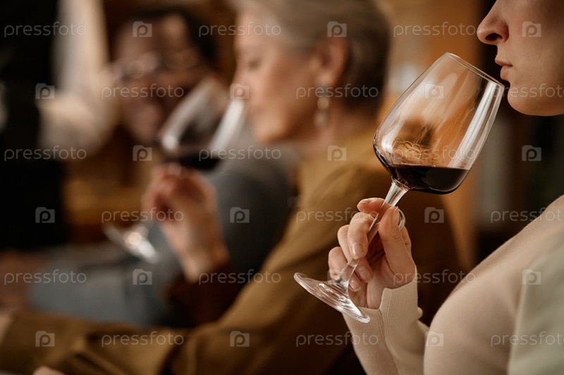 Женщина среднего возраста и старшая разнообразная группа тестируют красное вино в помещении