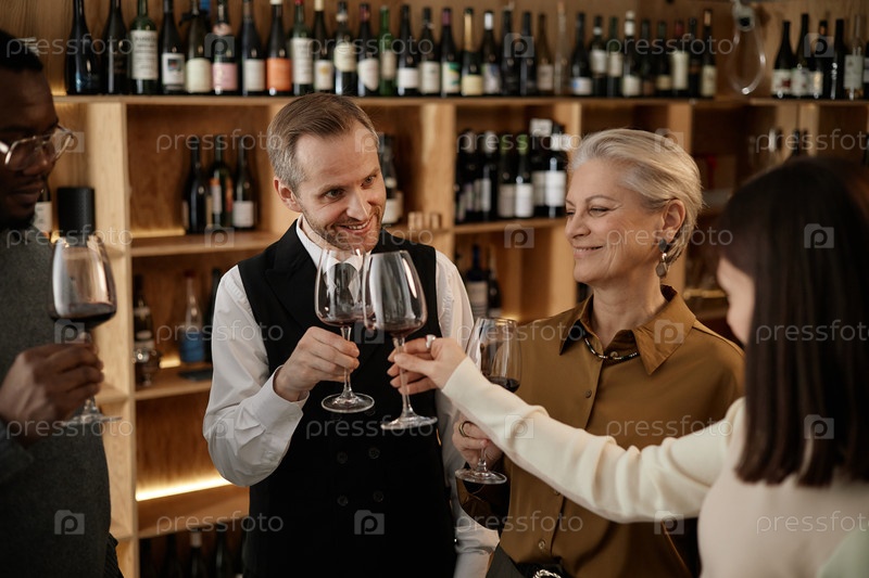 Разнообразная группа взрослых среднего возраста дегустирует красное вино вместе в помещении