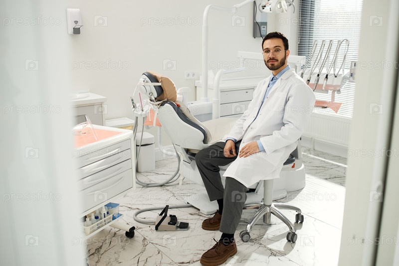 Молодой взрослый мужчина стоматолог ждет пациентов в стоматологическом кабинете